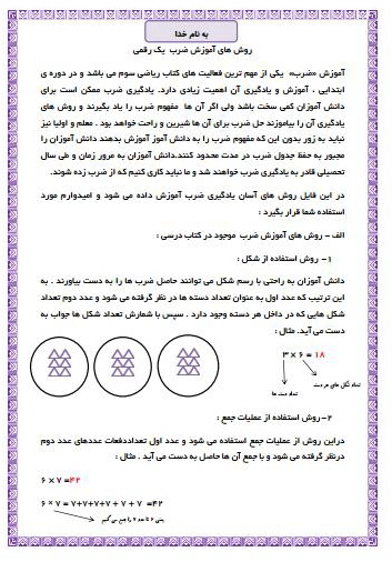 در این فایل روش های آموزش ضرب برای دانش آموزان کلاس سوم تهیه شده است که شامل موارد زیر است :