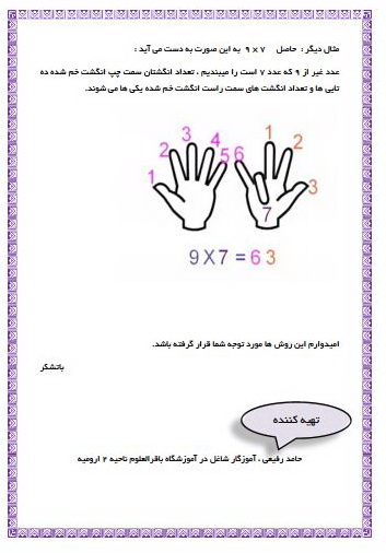 باتوجه به این که بچه ها در ضرب عدد 9 بیش تر از اعداد دیگر مشکل دارند این روش برای یادگیری مناسب است.این روش برای اعداد یک رقمی که یکی از آن اعداد 9 است کاربرد دارد.